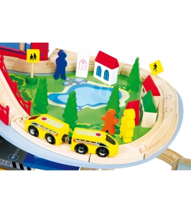Táto železnica so svojimi 34 koľajnicami, 2 mostíkmi, 1 tunelom a rampou poskytuje cestovné dobrodružstvo na 2 úrovniach! Výťah zdvíha vlaky do horného poschodia na farebnú lakovanú dosku z masívnej preglejky s pevnými drevenými nožičkami. Tí, ktorí chodia na bicykli, môžu cestovať s rozsiahlym príslušenstvom (domy, stromy, vozidlá, značky, signálne svetlá atď.)!
