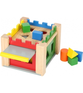9 pevných a farebne lakovaných tehál v 4 rôznych tvaroch. Novinka: Doska umiestnená priamo pod otvormi umožňuje "ovládať" vybraté možnosti. Keď sa doska vytiahne, správne umiestnené tehly prepadnú. Táto novinka v sortimente trénuje najmenšie motorové zručnosti.