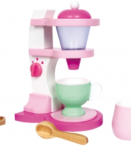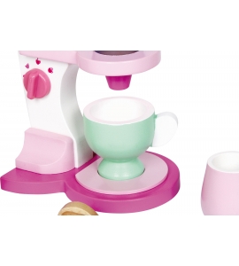 Farebný kávovar v pastelových farbách, táto súprava 2 šálky, 2 taniere, cukrová miska a kávovar vyrobená z rôznych druhov dreva je perfektným obohatením detskej kuchynky.