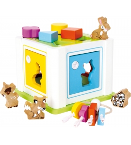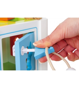 Táto skvelá hračka, robustná kombinácia farebnej preglejky a jemného lešteného bukového dreva, slúži viac než len na rozpoznávanie tvarov a rozpoznanie farieb! Motorické zručnosti sú skvele precvičené uzamknutím a odomknutím 4 dverí pomocou príslušných kľúčov. Veko sa dá otvoriť. Štyri detailné drevené tvary zvierat musia nájsť zodpovedajúci otvor.