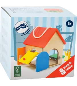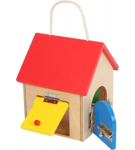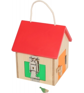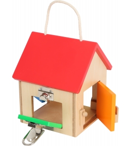 Tento dom poskytuje zážitok plný kľúčov! Vďaka svojim rôznym uzamykacím skrutkám, zámkom U-lock a závesu, tento zámkový dom vyrobený z FSC® 100% certifikovaného dreva podporuje rozvoj detskej koncentrácie a jemných motorických schopností. S týmto domom sa dá hravo precvičiť mnoho každodenných situácií. Tento zámkový dom sa dá vziať všade, vďaka vysoko kvalitnej výrobe dreva a kompaktnej veľkosti. Kábel umožňuje jednoduchú prepravu. Kto otvorí ďalší zámok?