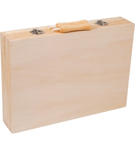 V tomto vysoko kvalitnom drevenom kufríku je 8 nástrojov o veľkosti 16 až 25 cm. Kladivo, píla a hasák sú zaistené otáčajúcimi sa kolíkmi. Ostatné náradie sa vkladá do vyklápajúcich sa držiakov, ktoré možno odstrániť odskrutkovaním veľkých drevených skrutiek. Drevené držadlá sú na lanách. Výborná sada dreveného náradia pre malých kutilov.