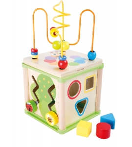 Ak v herni nie je veľa priestoru a nie je veľa priestoru na hranie, táto funkčná výcviková kocka je ideálna. Tréningová slučka, ktorú možno odobrať, ozubené kolesá, hodiny a logická hra, to hravo trénuje jemné motorické zručnosti a koncentráciu dieťaťa.