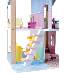Sen v pastelových farbách! Tento krásny drevený domček pre bábiky rozbúši srdce rýchlejšie. Každá izba je vymaľovaná v špecifickej farebnej schéme a 15 kusov nábytku ponúka veľa príležitostí na hranie. Dôležitý detail: domček stojí na otočnej základni a je hrateľný z viacerých strán súčasne.