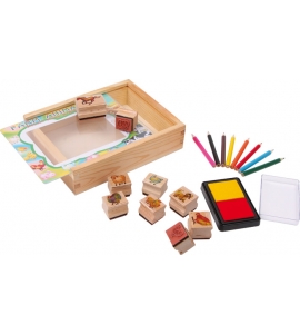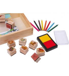 Zvierací obyvatelia farmy sa tu pomocou 9 pečiatok a 2 atramentových vankúšikov ocitnú na papieri! S 8 pastelkami sa môžu tieto motívy farebne vymaľovať a v drevenej krabici je dostatočne miesto na ďalšie potreby.
