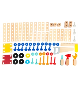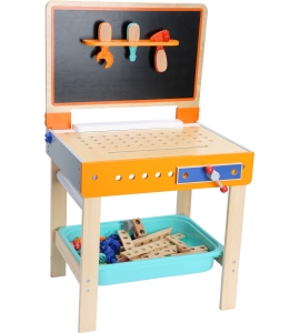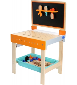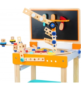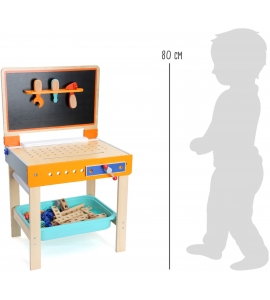 Kutilovia a umelci tu budú mať všetko, čo potrebujú! Či už ako funkčný pracovný stôl s praktickými nástrojmi alebo ako priestorovo nenáročný maliarsky stôl - pre kreatívne myslenie sú k dispozícii obe varianty. Deti tu môžu kladivom, skrutkovaním, pílením - a pre zmenu tempa maľovať! Tento robustný pracovný stôl zaujme početným príslušenstvom, ktoré zahŕňa všetko od drevenej píly až po skrutky zo stabilného plastu. Zadnú stenu je možné sklopiť a použiť ako plochu na maľovanie a kreslenie! Papierová rolka sa nachádza pod stolom a je k nej ľahko prístupný a použiteľný. Fantastická hračka do detskej izby!