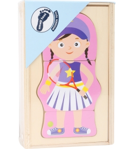 Sestra alebo tenisová hráčka - čo je vaša vysnívaná práca? Toto zábavne obliekacie puzzle z farebne maľovaného dreva zobrazuje štyri sady oblečenia pre rôzne kariéry. Využijte rôzne kombinácie oblečenia, tenistka môže mať aj uniformu. Každá nová hra prináša množstvo novej zábavy.