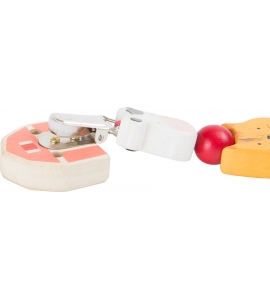Vysoko kvalitný retiazka s figúrkami, s praktickým klipom, aby sa milovaný cumeľ nestratil. Motívy drevenej farmy majú okrúhle okraje a preto je skvelé hrať sa s nimi. Retiazka je tiež odolná voči slinám, rovnako ako nehrdzavejúce a bez niklu a je najlepšie čistiť ju utieraním vlhkou handričkou.