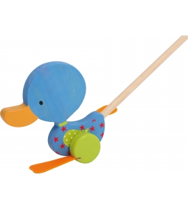 Táto roztomilá kačica vyrobená z lakovaného dreva, keď sa tlačí, sa veselo si šľape nožičkami.