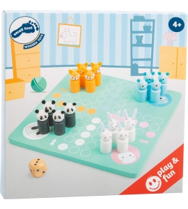 Ktoré zviera sa môže dostať do ich domu ako prvé? V tejto šikovnej hre ludo v trendových pastelových farbách sa po doske preháňajú drevené figúrky v tvare zajaca, pandy, medveďa a líšky. Číslo na kocke hovorí hráčom, koľko krokov môže každá figúrka zvieraťa urobiť. Figúrky s filcovými ušami.