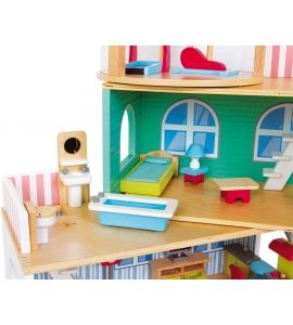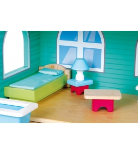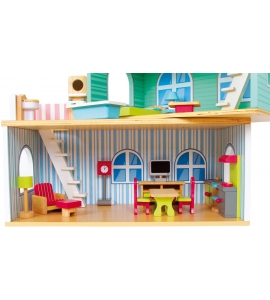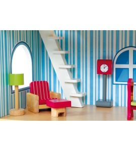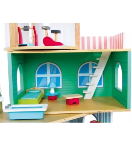 Tento dom pre bábiky sa skladá až z troch jednotlivých prvkov! Prvky vyrobené z masívneho masívneho dreva a preglejky môžu byť umiestnené vedľa seba, navzájom nad sebou alebo použité ako samostatné oddelenie. Otvorené strany ponúkajú drobným rukám voľný prístup do interiéru. 22 častí sady nábytku ponúka dostatok príležitostí pre hru. Nábytok je vyrobený z jemne lešteného a lakovaného dreva.